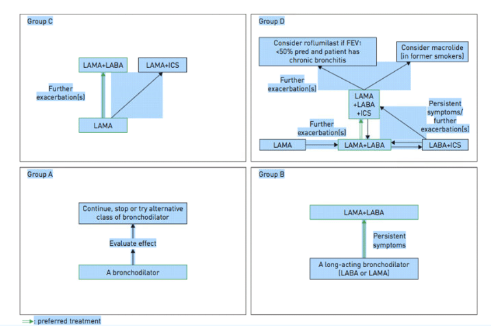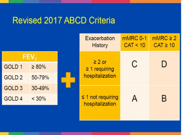 The appropriate medications for COPD depend on its stage of severity as determined by symptoms. The Global Initiative for Chronic Obstructive Lung Disease (GOLD) has proposed a strategy that is widely accepted. GOLD categorizes COPD severity as follows: