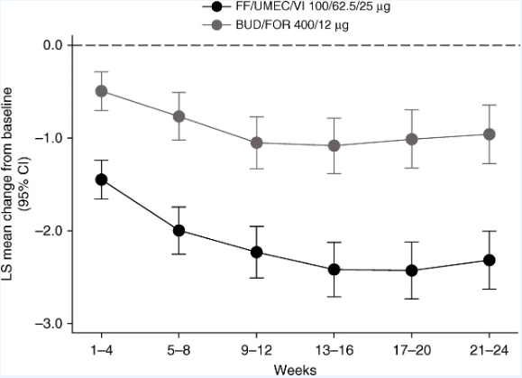 Conclusions: These results support the benefits of single-inhaler triple therapy compared with ICS/LABA therapy in patients with advanced COPD.
