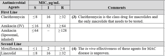 M. abscessus isolates are uniformly resistant to the standard antituberculous agents (358–360). Because of variable in vitro drug susceptibilities to some drugs, antibiotic susceptibility testing of all clinically significant isolates is recommended. Acquired mutational resistance to clarithromycin (23S rRNA gene) and amikacin (16S rRNA gene) can occur because isolates of M. abscessus have only a single copy of the gene. Untreated M. abscessus isolates generally have low or intermediate MICs, compared with achievable drug levels, to clarithromycin (100%), amikacin (90%), and cefoxitin (70%). Some isolates have low or intermediate MICs to linezolid. Some isolates (50%) also show low MICs to imipenem, although, as noted, this determination is not reliable (see Laboratory Procedures). Isolates also have low MICs to clofazimine, although methodology and MIC breakpoints have not yet been addressed by the CLSI for this agent.