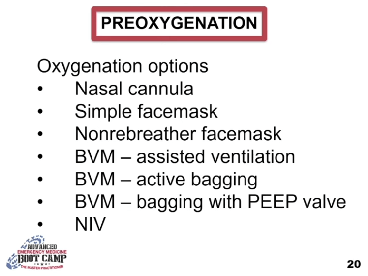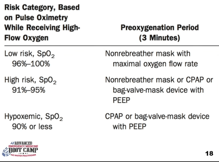 Weingart SD, Levitan RM. Preoxygenation and prevention of desaturation during emergency airway management. Ann Emerg Med. 2012 Mar;59(3):165-75.e1. doi: 10.1016/j.annemergmed.2011.10.002. Epub 2011 Nov 3. PMID: 22050948.