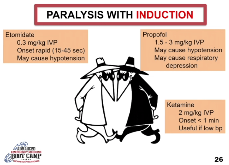 - etomidate 0.3mg/kg IVP, rapid onset 15-45 sec, may cause hypotension